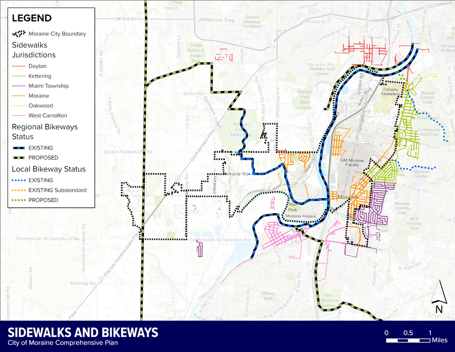 Whether access to the interstate or the Great Miami Recreational Trail, Moraine’s infrastructure is a boon. Developers and major business stakeholders agree that highway accessibility is a major attraction for the City. Opportunities have been identified to set Moraine up for continued success through its infrastructure, such as improving trail connectivity and actively participating in other agencies’ project planning. Since the bulk of Moraine’s infrastructure is in solid shape this section focuses on examining where enhancements to these systems (i.e., roads, sewers, bridges, trails, etc.) can help initiate or enhance the goals of this Plan’s other sections.